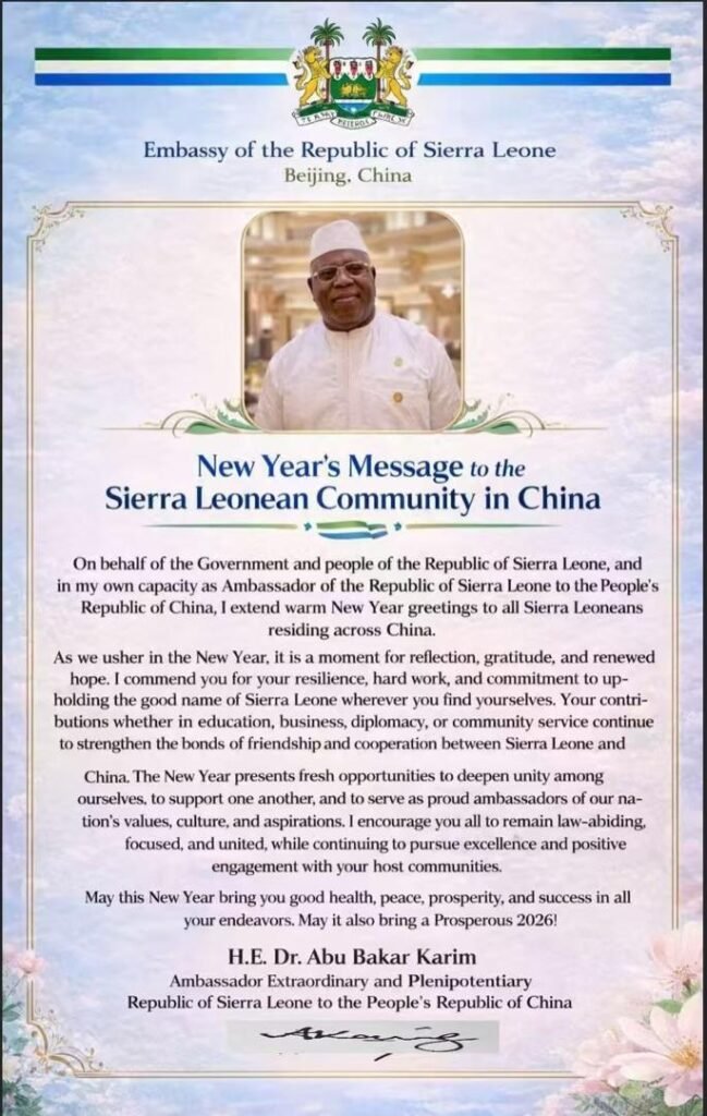 On behalf of the Government and people of the Republic of Sierra Leone, and in my own capacity as Ambassador of the Republic of Sierra Leone to the People’s Republic of China, I extend warm New Year greetings to all Sierra Leoneans residing across China.